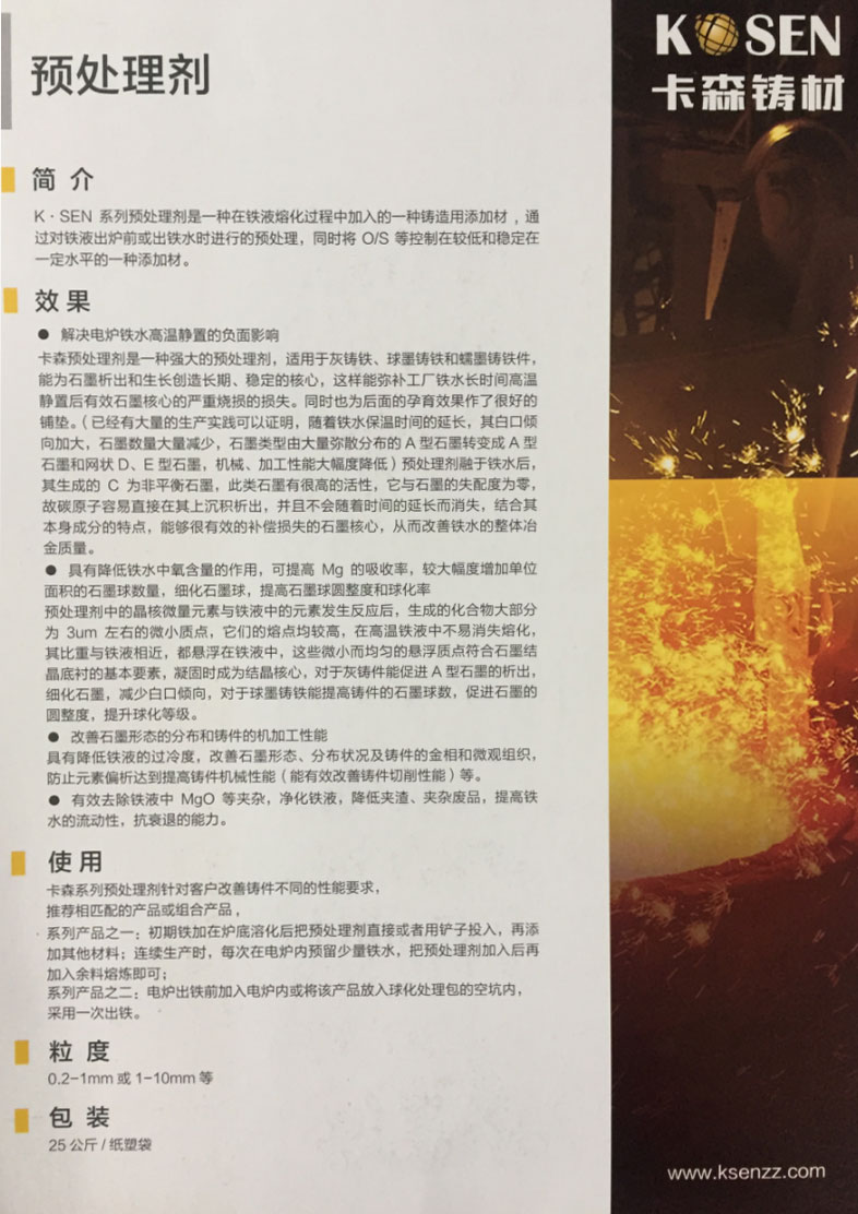 (7)卡森公司的增碳剂为石墨化增碳剂,实践中其吸收率均稳定在90-95%之间,如果出现吸收率低于90%,可能的因素是加入方式有问题,每个单位情况不同,建议用户自行跟踪加入方式,以稳定吸收率,由于增碳剂品种较多,废钢中S的含量并不高,因此灰铸铁的生产可以选择S含量高一点的增碳剂,经济性会更好。预处理剂成分也较为稳定,加入量以0.5-1%铁水重量为宜,配料时推荐值为:Si含量:63-65% C含量:23-25%,可以取中间值,无需考虑烧损。附图二为预处理剂功能介绍附图一