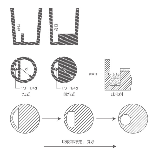 凹槽的制作方法如下图所示,在铁水包的一角作一个半圆的槽,可以设置成堤坝 式和凹坑式两种。采用坝式的方法,有铁水包也可以使用等优点;采用凹坑式的方法, 因为球化剂的反应是在铁水包最深部进行,从而镁的吸引率较好。凹槽的大小应根据 铁水包的形状、球化剂种类及浇注温度进行调整,宽度在1/3-1/4时效果较好。高度 以在凹槽中放入球化和覆盖剂后,留出20mm余量为佳。